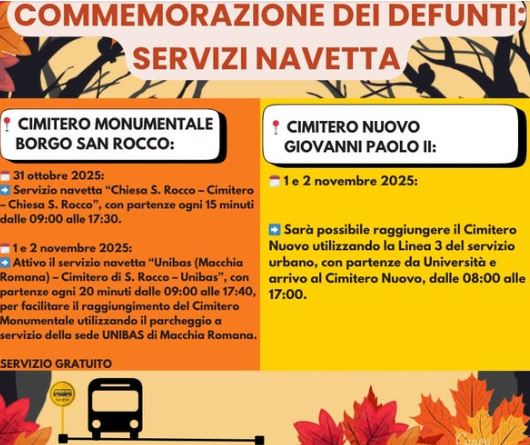 Servizio navetta GRATUITO “Parcheggio Unibas (Macchia Romana) – Chiesa S. Rocco – Cimitero S. Rocco – Parcheggio Unibas (Macchia Romana)”, con partenze ogni 20 minuti dalle 09:00 alle 17:40.