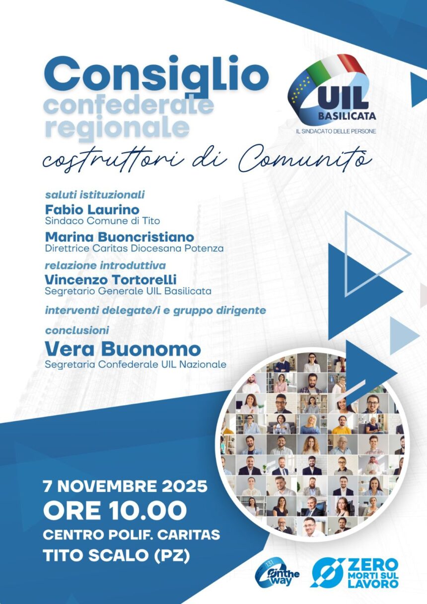 Venerdì 7 novembre 2025 – “Costruttori di comunità” è il tema del Consiglio Federale regionale della Uil di Basilicata in programma oggi, 7 novembre, alle 10 nel Centro Polifunzionale Caritas – Tito Scalo (PZ).