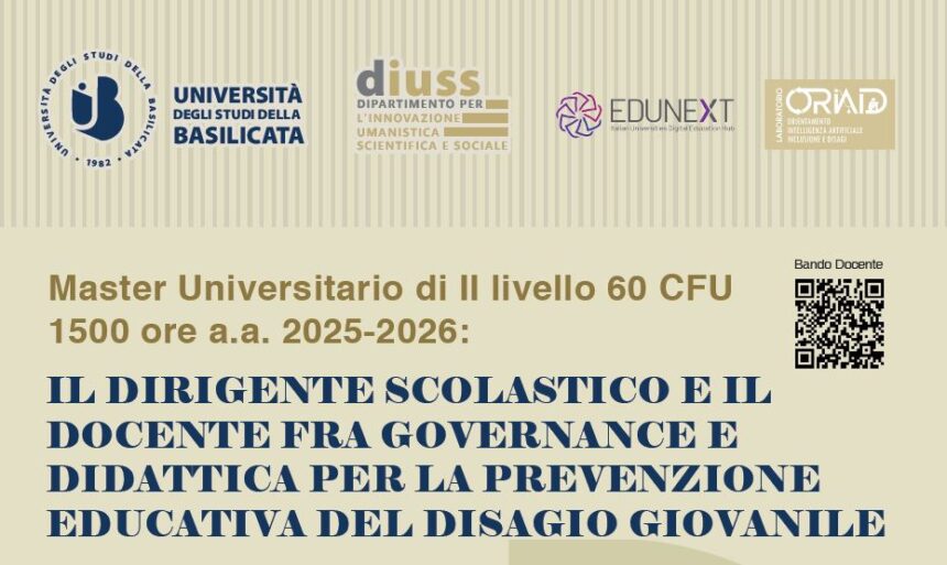 Giovedì 20 novembre 2025 – Online i bandi dei Master di II livello promossi dall’Università degli Studi della Basilicata per la formazione dei docenti e dei dirigenti scolastici.
