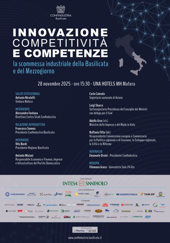 Venerdì 28 novembre 2025 – Alla vigilia dell’assemblea pubblica che è in programma nel pomeriggio di oggi, 28 novembre, a Matera, il presidente di Confindustria Basilicata, Francesco Somma, interviene sui temi che saranno dibattuti durante le assise.