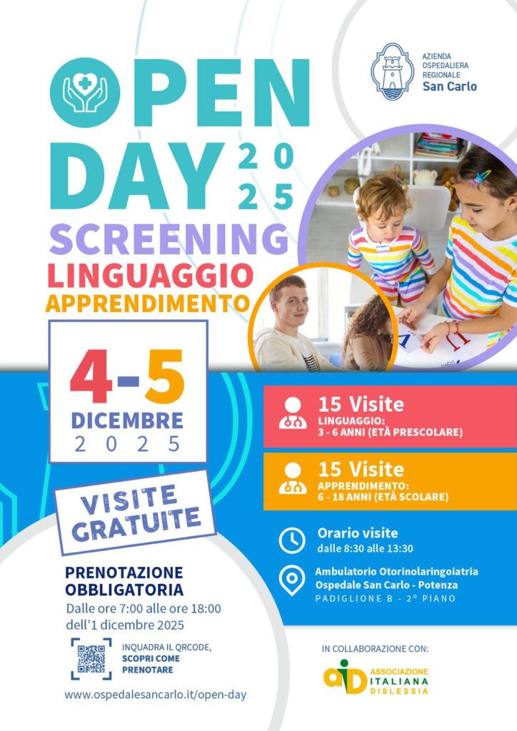 Lunedì 1 dicembre 2025 – Nuovo appuntamento con gli screening gratuiti organizzati dall’Azienda Ospedaliera Regionale San Carlo di Potenza, che annuncia un open day medico/logopedico sul disturbo del linguaggio e dell’apprendimento dedicato a bambini e ragazzi.