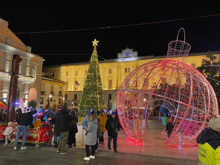 Stelle sulla torre Guevara, un gigantesco fiocco di neve davanti il Palazzo di città in piazza Matteotti e il grande albero con alle sue spalle il palazzo della prefettura ricoperto da un velo di luci. Le festività natalizie sono ufficialmente iniziate a Potenza con l’accensione in centro storico delle luminarie.
