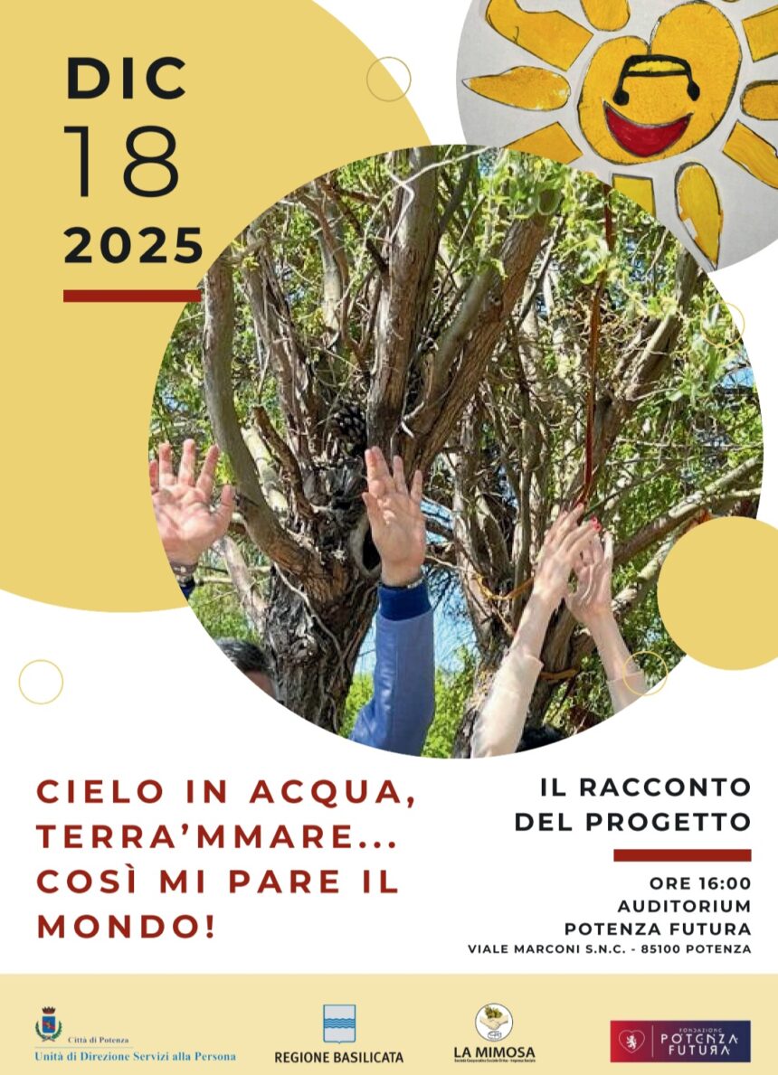 Martedì 16 dicembre 2025 – Si terrà Giovedì 18 dicembre 2025, a partire dalle ore 16:00, nell’Auditorium Potenza Futura (Viale Marconi s.n.c.), l’evento pubblico “Cielo in acqua, Terra’mmare… così mi pare il mondo!”, il racconto del progetto, promosso nell’ambito delle politiche sociali del Comune di Potenza.