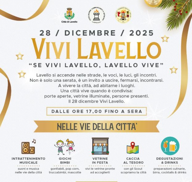 Il 28 dicembre, a partire dal pomeriggio e fino alla sera, arriva “Vivi Lavello”, la prima edizione di un evento diffuso che coinvolgerà il centro cittadino grazie all’impegno, alla passione e allo spirito di collaborazione dei commercianti di Lavello.