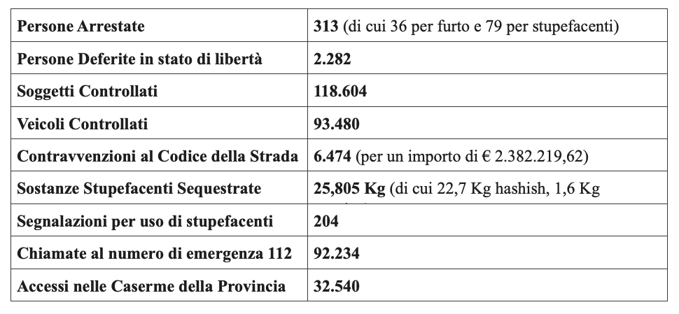 - contrasto ai reati predatori: un impegno incessante è stato dedicato alla prevenzione di furti in abitazione, esercizi commerciali e sportelli ATM, attraverso il presidio delle zone sensibili e un monitoraggio costante dei flussi delinquenziali.