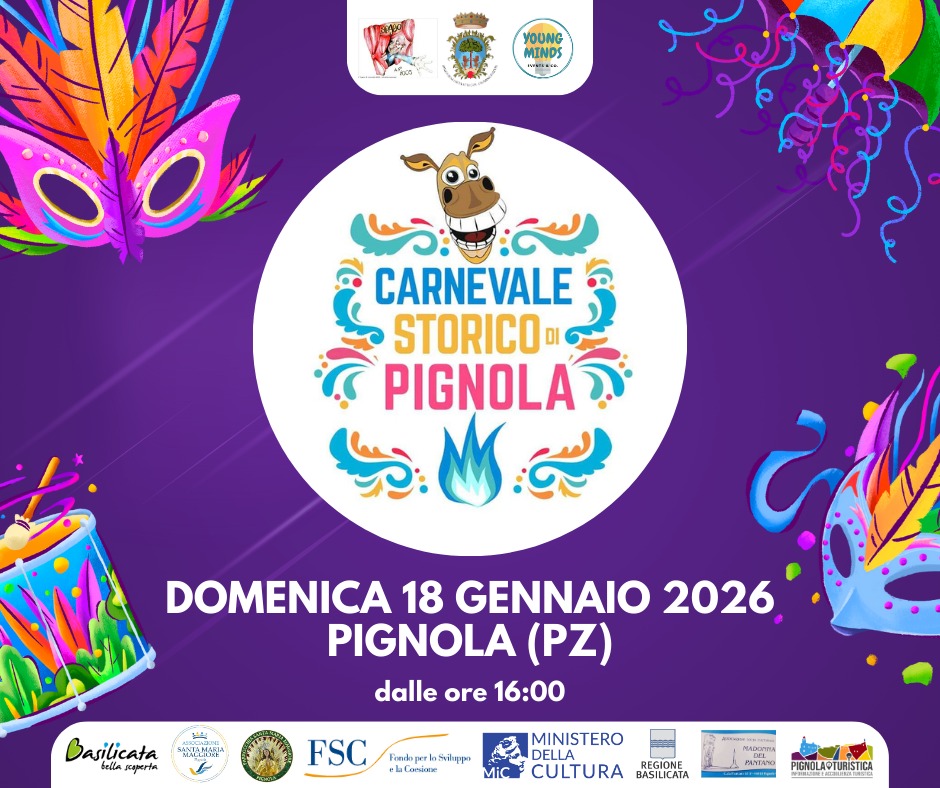 Artisti, maschere e gruppi trasformeranno il pomeriggio in un’avventura incredibile. Sarà impossibile restare fermi: tra musica travolgente e spettacoli, celebreremo insieme Pignola, città del folklore 2026.