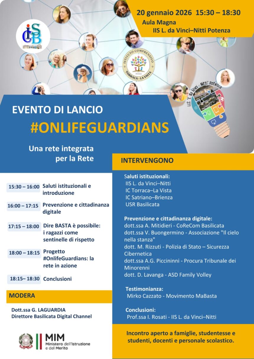 Lunedì 19 gennaio 2025 – Le scuole fanno rete contro il Cyberbullismo. Il 20 gennaio prossimo a partire dalle ore 15.30, nell’aula magna dell’IIS L. da Vinci – Nitti, a Potenza, si terrà l’evento di lancio del progetto #OnlifeGuardians – Una rete integrata per la Rete.