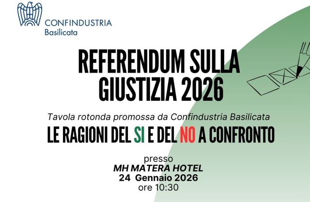 Mercoledì 21 gennaio 2026 – In vista del referendum popolare confermativo della Riforma della Giustizia del 22 e 23 marzo prossimi, Confindustria Basilicata ha inteso promuovere un confronto pubblico che si terrà sabato 24 gennaio, a partire dalle ore 10.30, presso l’UNAhotels Mh Matera.
