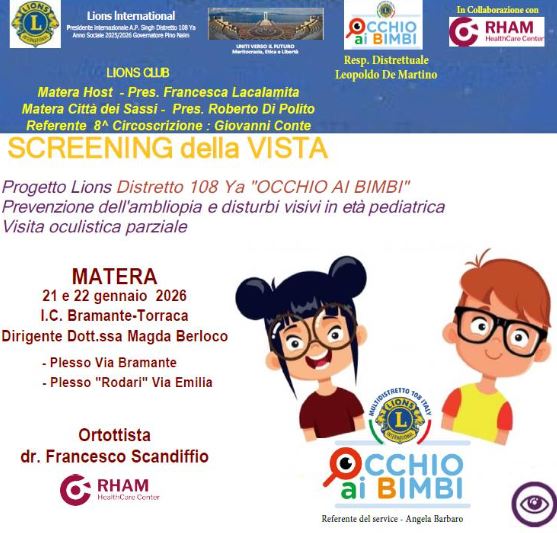 Giovedì 22 gennaio 2026 – E’ in corso da ieri, 21 gennaio, e si concluderà oggi, 22 gennaio nella scuola dell’infanzia Rodari di Via Emilia e nel plesso di Via Bramante,5 dell’Istituto comprensivo Bramante-Torraca di Matera, la Campagna di prevenzione dell’Ambliopia a cura dei Lions materani.