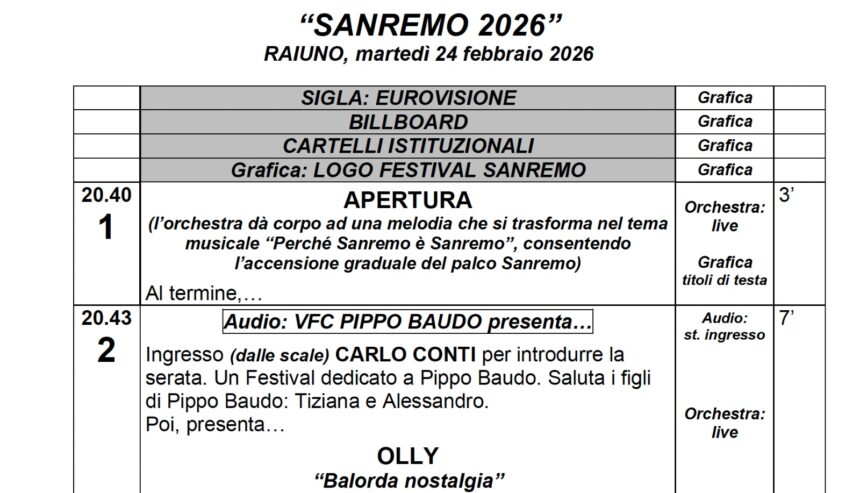 SCARICA LA SCALETTA DELLA PRIMA SERATA DEL FESTIVAL DI SANREMO (CLICCA QUI)