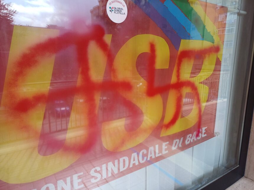 POTENZA – Tra la giornata di sabato 7 e domenica 8 marzo, è stata vandalizzata la sede della USB (Unione Sindacale di Base) di Potenza in piazza Bratislava. Svastiche sono state disegnate con una vernice rossa sulla porta di ingresso e su una colonna dei portici oltre alla distruzione di una bandiera della Palestina.