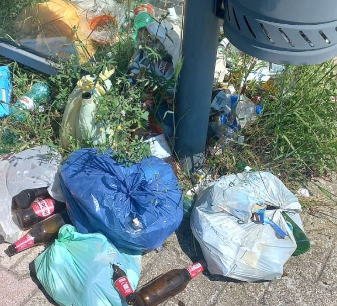 Le immagini parlano da sole: rifiuti abbandonati ovunque, bottiglie rotte, sacchi lasciati a terra, sporcizia diffusa e totale incuria.