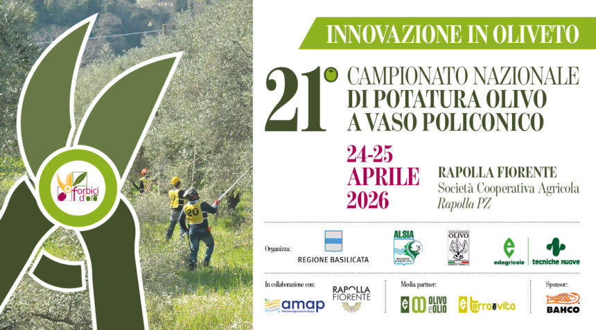 Giovedì 23 aprile 2026 – occa alla Basilicata quest’anno, e per la prima volta, ospitare gli eventi “Innovazione in Oliveto” di Edagricole, storica casa editrice italiana, e il “Campionato nazionale di potatura a vaso policonico”.