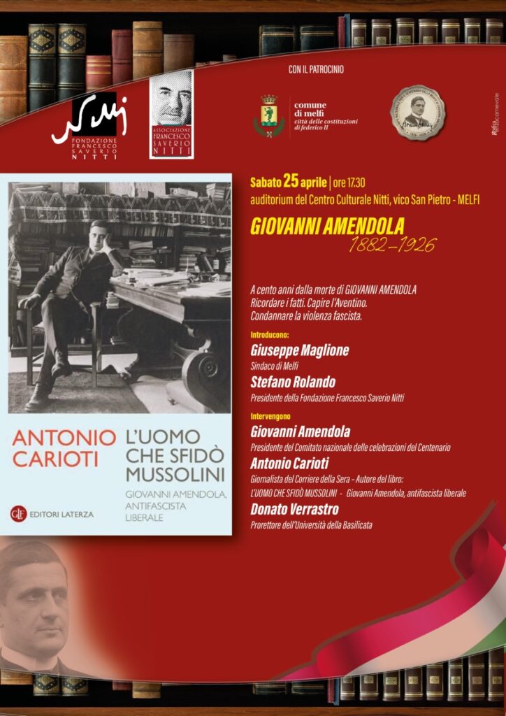 Introdotti dal sindaco di Melfi Giuseppe Maglione e dal presidente di Fondazione Nitti Stefano Rolando, i lavori proseguiranno con gli interventi programmati di Giovanni Amendola, presidente del Comitato nazionale per il centenario della morte di Giovanni Amendola e nipote dello stesso, di Donato Verrastro, prorettore e docente di Storia Contemporanea dell’Università degli Studi della Basilicata, e di Antonio Carioti, giornalista del ‘Corriere della Sera’ e autore del libro “L’uomo che sfidò Mussolini”-Giovanni Amendola, antifascista liberale”(ed. Laterza, 2026).
