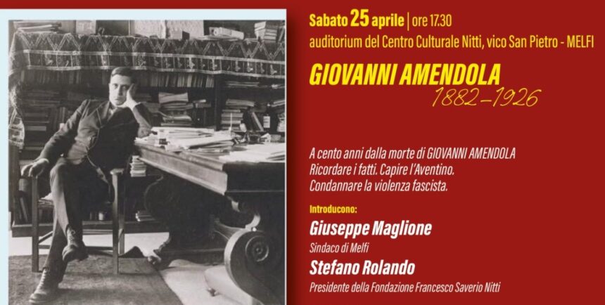 MELFI – Sabato 25 Aprile, alle ore 17.30 presso l’auditorium del centro culturale Nitti di Melfi (vico San Pietro snc), è in programma l’evento culturale “A cento anni dalla morte di Giovanni Amendola (1882-1926). Ricordare i fatti. Capire l’Aventino. Condannare la violenza fascista” organizzato da Fondazione e Associazione “Francesco Saverio Nitti” con il patrocinio del comune di Melfi e del Comitato nazionale per le celebrazioni del Centenario della morte di Giovanni Amendola.